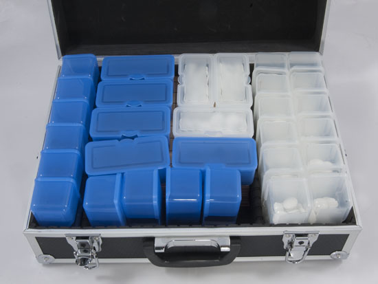 9x9-Sperrholzbrett [12-br010] und 2 x 40 20,5x7mm-Glassteinen [12-st004] sowie einem Einführungsbuch pro Koffer.