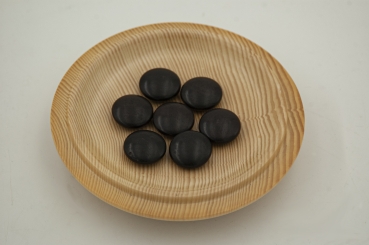 Diese Steine aus Ebenholz sind aus Holz der Gattung Diospyros. Ebenholz zeichnet sich durch seine tiefe, schwarze Farbe und seine dichte Textur aus. Das Holz ist schwer, hart und hat eine feine Maserung. Ebenholz wird aufgrund seiner ästhetischen Qualitäten und Härte in der Möbelherstellung, der Herstellung von Musikinstrumenten (insbesondere Griffbretter von Streichinstrumenten), Schnitzereien, Schmuck und anderen hochwertigen Handwerksarbeiten verwendet.