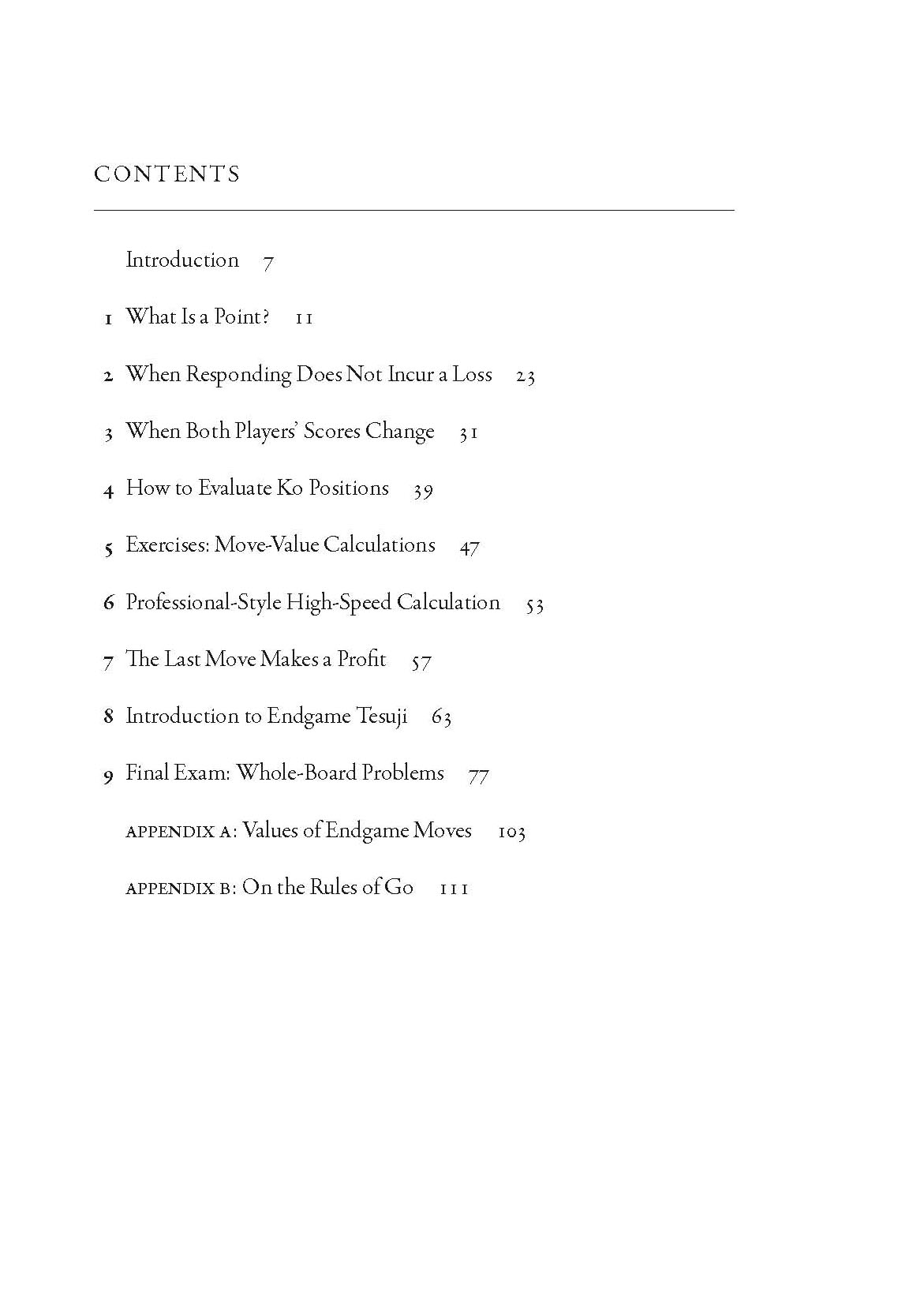 Um im Endspiel bsser zu werden, muss man lernen, wie man Gebiete und den Wert von Zügen berechnet. Egal, welchen Stil ein Spieler hat, am Ende einer Partie kommt es darauf an zu zählen. Deshalb ist es wichtig zu wissen, wie man das macht - das gilt für jeden Go-Spieler.