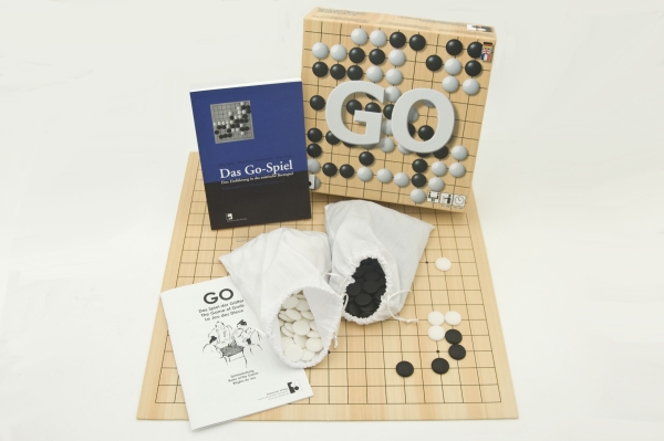 Go-Set mit einem 19x19-Brett aus Karton mit einem kombinierten 13x13/9x9-Brett auf der Rückseite und 2 x 180 Kunststoffsteinen* im Stoffbeutel in einer praktischen Schachtel. Mit einer dreisprachigen Spielanleitung (de/en/fr).